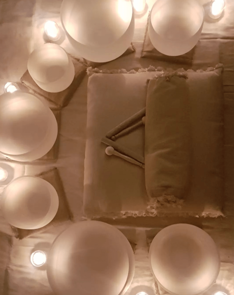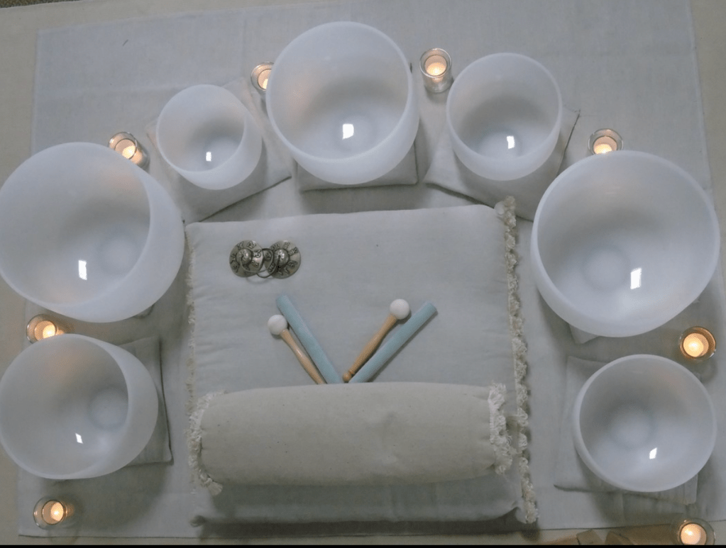 Sound therapy and sound baths are an intuitive practice wherein the therapist or practitioner uses various instruments including tuning forks, gongs, Tibetan bowls, crystal bowls, drums, tingshas, shakers, chimes, didgeridoo and also the human voice to produce specific sounds, frequencies, vibrations and harmonics to promote healing of the mind and body.